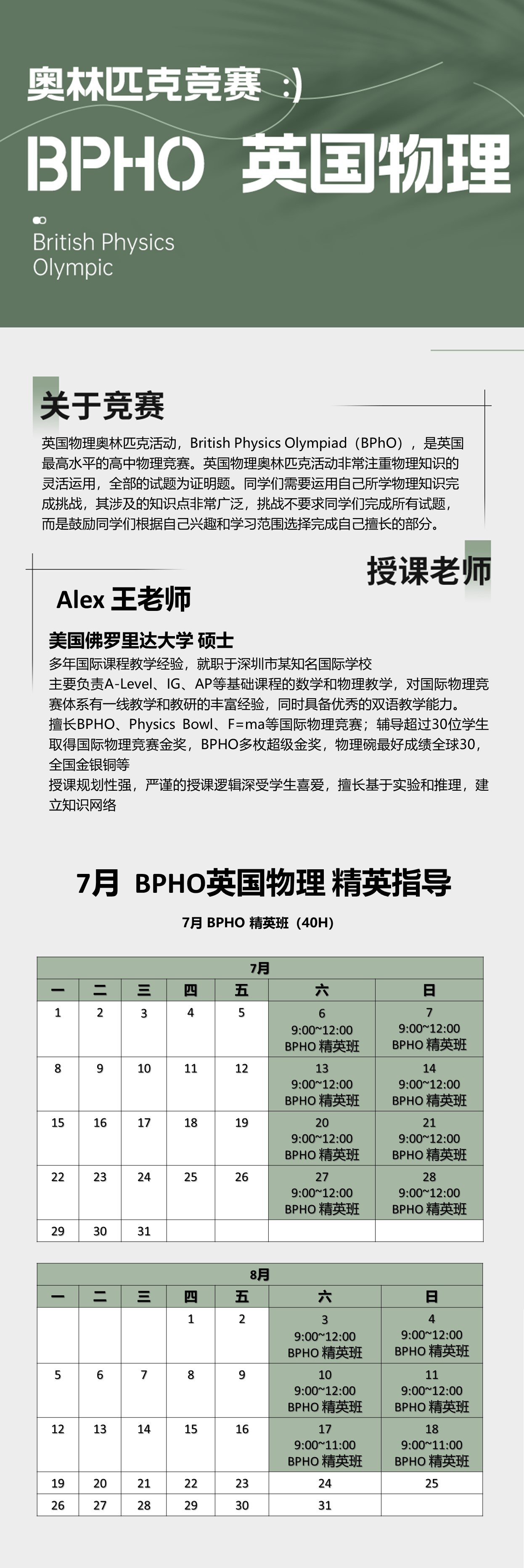 简介英国物理测评始于 1979 年,1983 年正式为英国选拔国家代表队参与国际物理挑战。英国物理测评组委会主要由牛津大学、英国物理学会和 Odgen 基金会组成,办公室设在牛津大学物理系。英国物理测评非常注重物理知识的灵活运用,全部的试题为证明题。同学们需要运用自己所学物理知识完成挑战,其涉及的知识点非常广泛,考试不要求同学们完成所有试题,而是鼓励同学们根据自己兴趣和学习范围选择完成自己擅长的部分。“英国物理测评 (BPhO Round 2)”,暨英国物理测评国家队最后一轮选拔,难度高于 BPhO。在英国仅邀请 BPhO 中获得超级金牌 (Top Gold) 的选手参加,并从中选拔优秀选手进入英国物理国家队集训。通过该系列活动,中国与英国学生将有机会同台竞技,统一考试,试卷送往牛津大学物理系统一评分,同等争取全球金银铜牌。中英选手唯一区别在于非英国国籍学生不能入选英国物理测评国家队。我们鼓励物理成绩优秀的学生参与。此外,获奖者将有机会获邀参加英国物理奥赛集训营 (BPhO China Camp)。