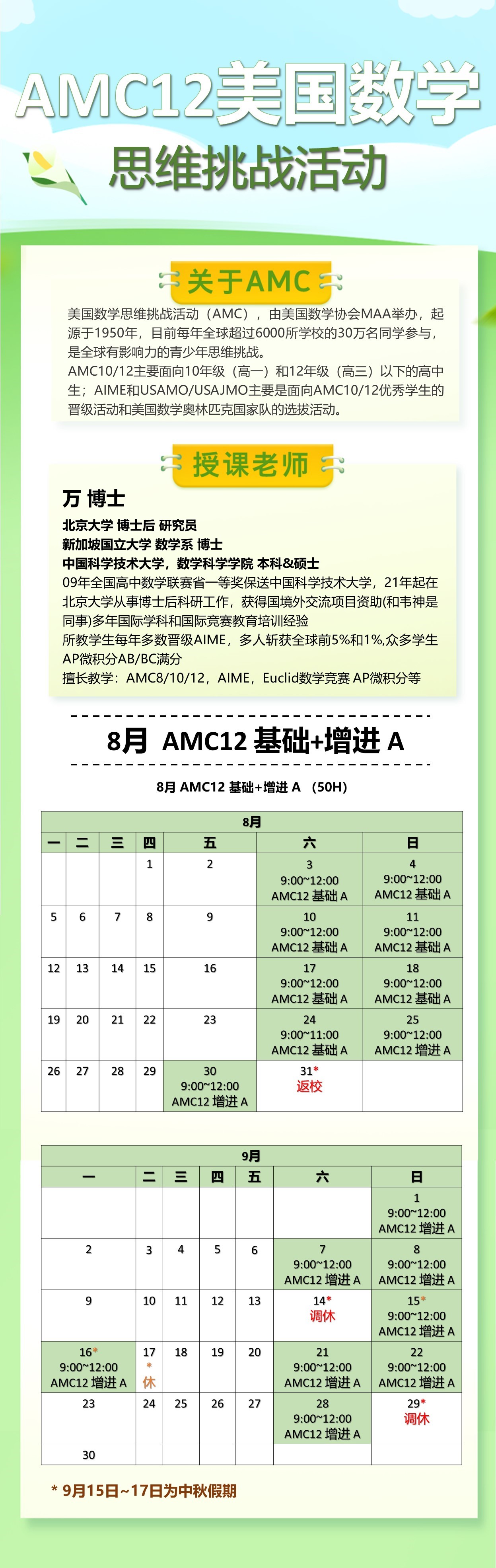 美国数学思维挑战活动(AMC),由美国数学协会MAA举办,起源于1950年,目前每年全球超过6000所学校的30万名同学参与,是全球有影响力的青少年思维挑战。AMC10/12主要面向10年级(高一)和12年级(高三)以下的高中生;AIME和USAMO/USAJMO主要是面向AMC10/12优秀学生的晋级活动和美国数学奥林匹克国家队的选拔活动。
