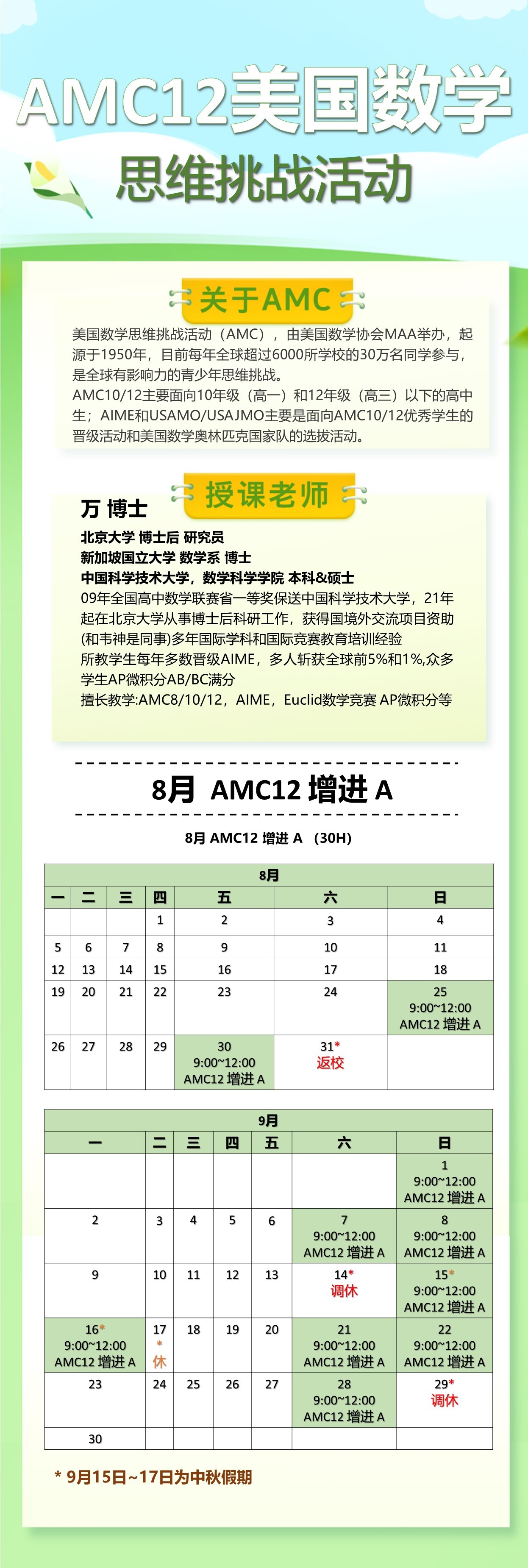 美国数学思维挑战活动(AMC),由美国数学协会MAA举办,起源于1950年,目前每年全球超过6000所学校的30万名同学参与,是全球有影响力的青少年思维挑战。AMC10/12主要面向10年级(高一)和12年级(高三)以下的高中生;AIME和USAMO/USAJMO主要是面向AMC10/12优秀学生的晋级活动和美国数学奥林匹克国家队的选拔活动。