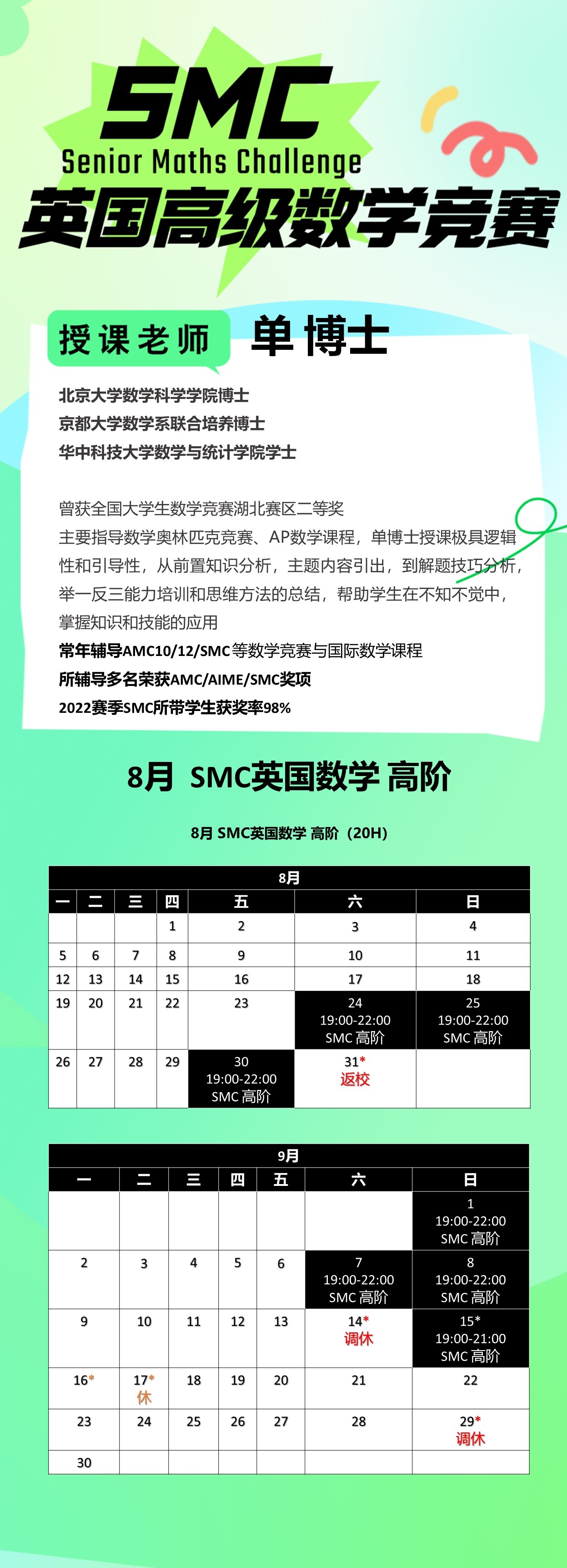 其中英国数学测评(高级)/ SMC 是面向 12 年级(高三年级)及以下年级学生的数学测评活动,注重培养学生充分调动逻辑思维,精确且流畅地使用数学技术来解决问题的能力,题目极具挑战性和灵活性,通常涵盖几何、数论、排列组合等重点高中数学知识点,也搭配少量的代数和应用题目,以及其他一些更具挑战性的题目(不涉及高等数学知识),极大开拓选手的数学视野,是 BMO的前置测评活动。