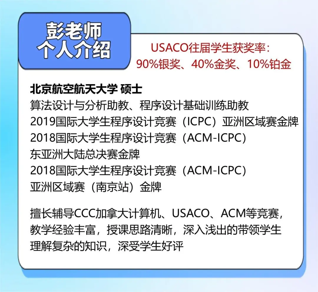 多年计算机竞赛辅导经验,教学经验丰富,其中USACO往届学生获奖率:90%银奖、40%金奖、10%白金。