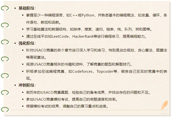 USACO美国计算机竞赛是一项面向中学生的信息学竞赛,也是美国大学申请过程中非常有含金量和竞争力的竞赛之一。该竞赛一共分为四个级别,分别是铜级、银级、金级、铂金(或称白金)级。只要注册USACO账号即为铜级,这也意味着对编程零基础的孩子都可以参与其中。以下是对USACO计算机竞赛零基础入门到拿奖晋级攻略的详细分析: