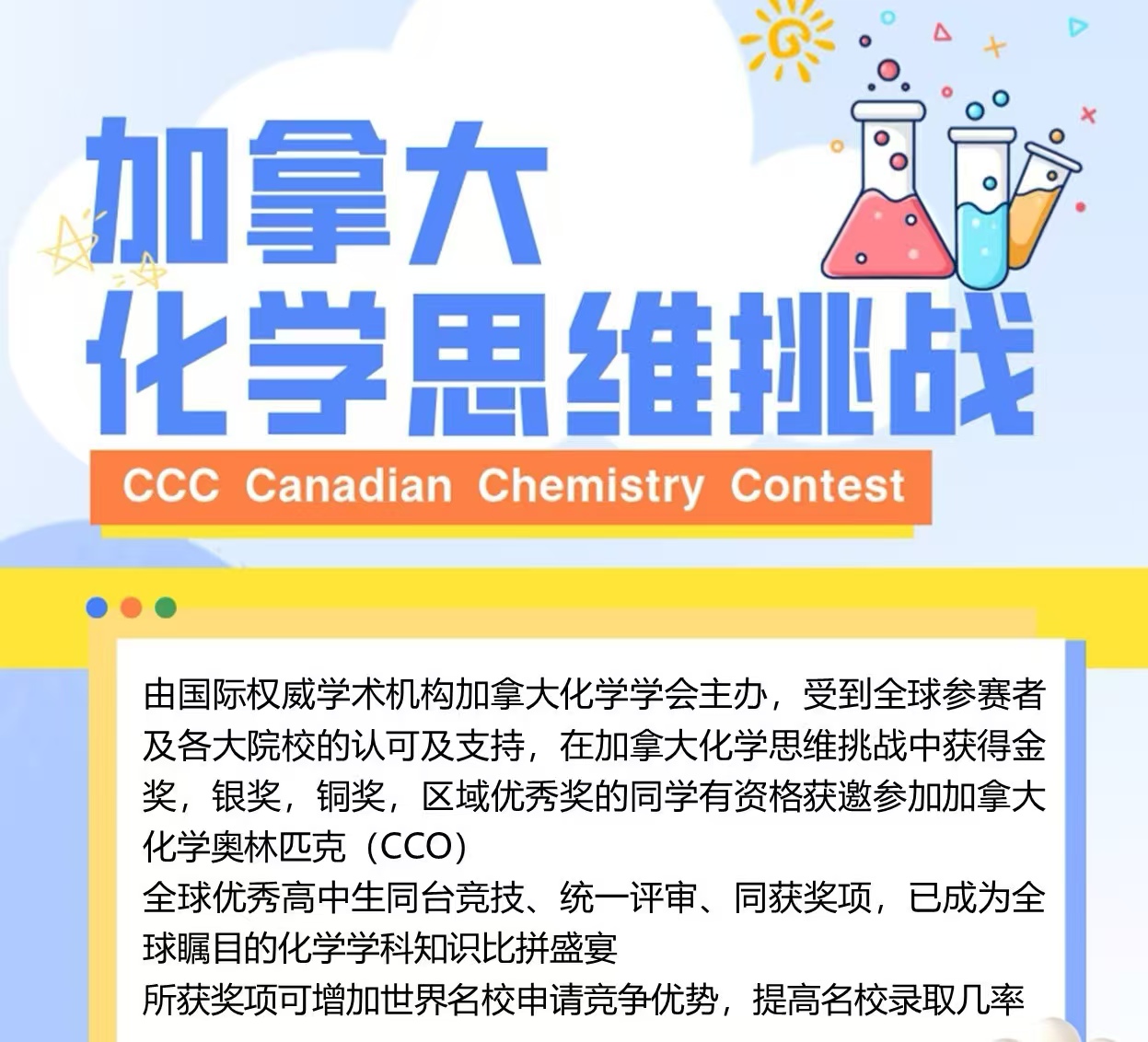 加拿大化学思维挑战(Canadian Chemistry Contest,简称CCC)是由加拿大化学学会主办的一项具有全球影响力的化学学术活动。该挑战旨在激发学生对化学学科的兴趣,培养科学思维与解决问题的能力,其成绩在国际范围内备受认可,成为学生提升学术背景、增强名校申请竞争力的重要途径之一。