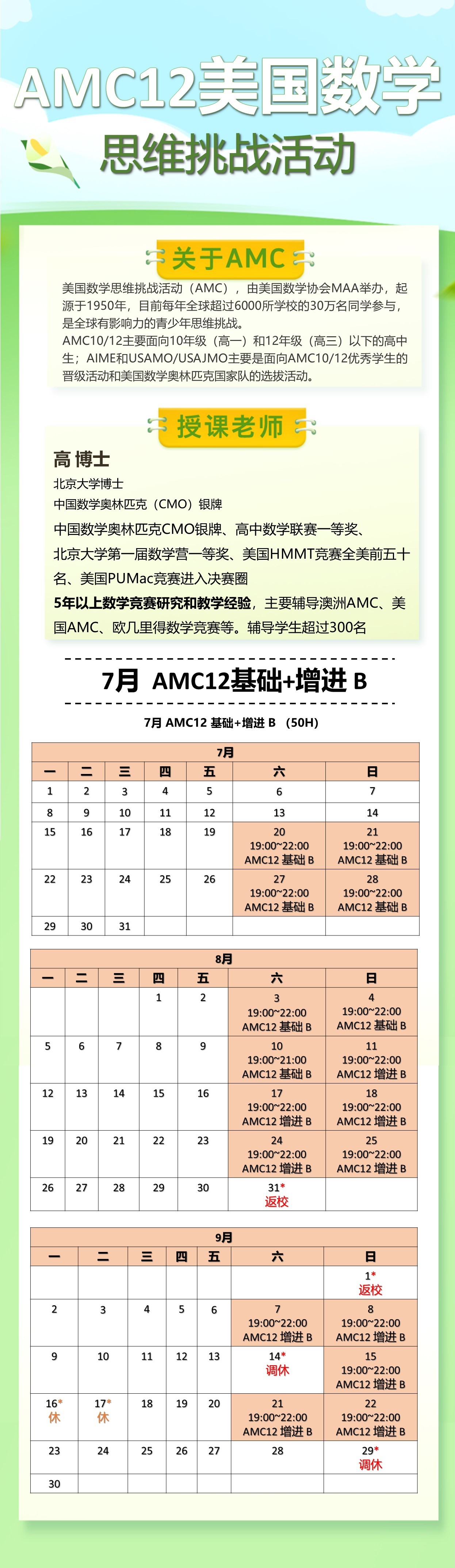 了解更多关于:7月  AMC12基础+增进 B(50H)信息,欢迎拨打免费报名咨询电话:【400 102 1394