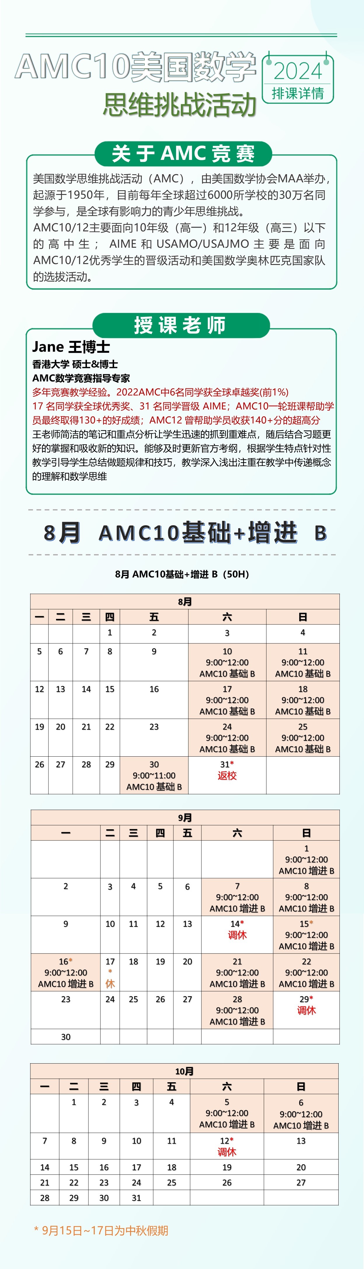 授课老师:Jane 王博士——香港大学硕士&博士、AMC数学竞赛指导专家