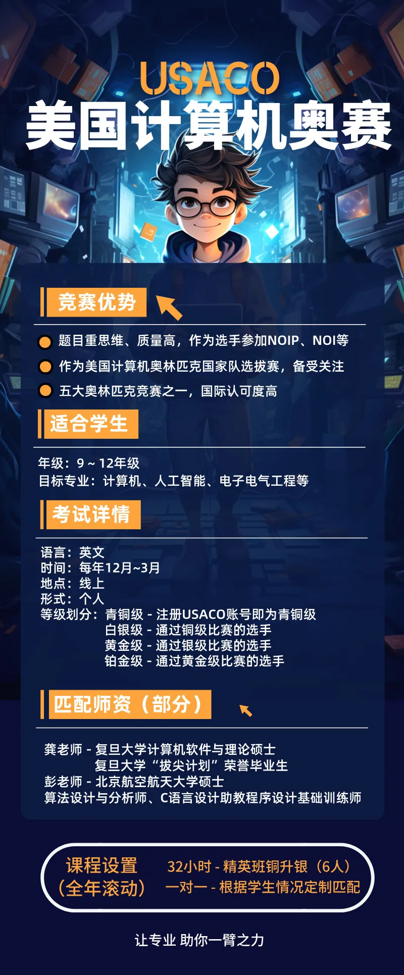 USACO美国计算机竞赛是一项面向中学生的信息学竞赛,也是美国大学申请过程中非常有含金量和竞争力的竞赛之一。该竞赛一共分为四个级别,分别是铜级、银级、金级、铂金(或称白金)级。只要注册USACO账号即为铜级,这也意味着对编程零基础的孩子都可以参与其中。以下是对USACO计算机竞赛零基础入门到拿奖晋级攻略的详细分析:
