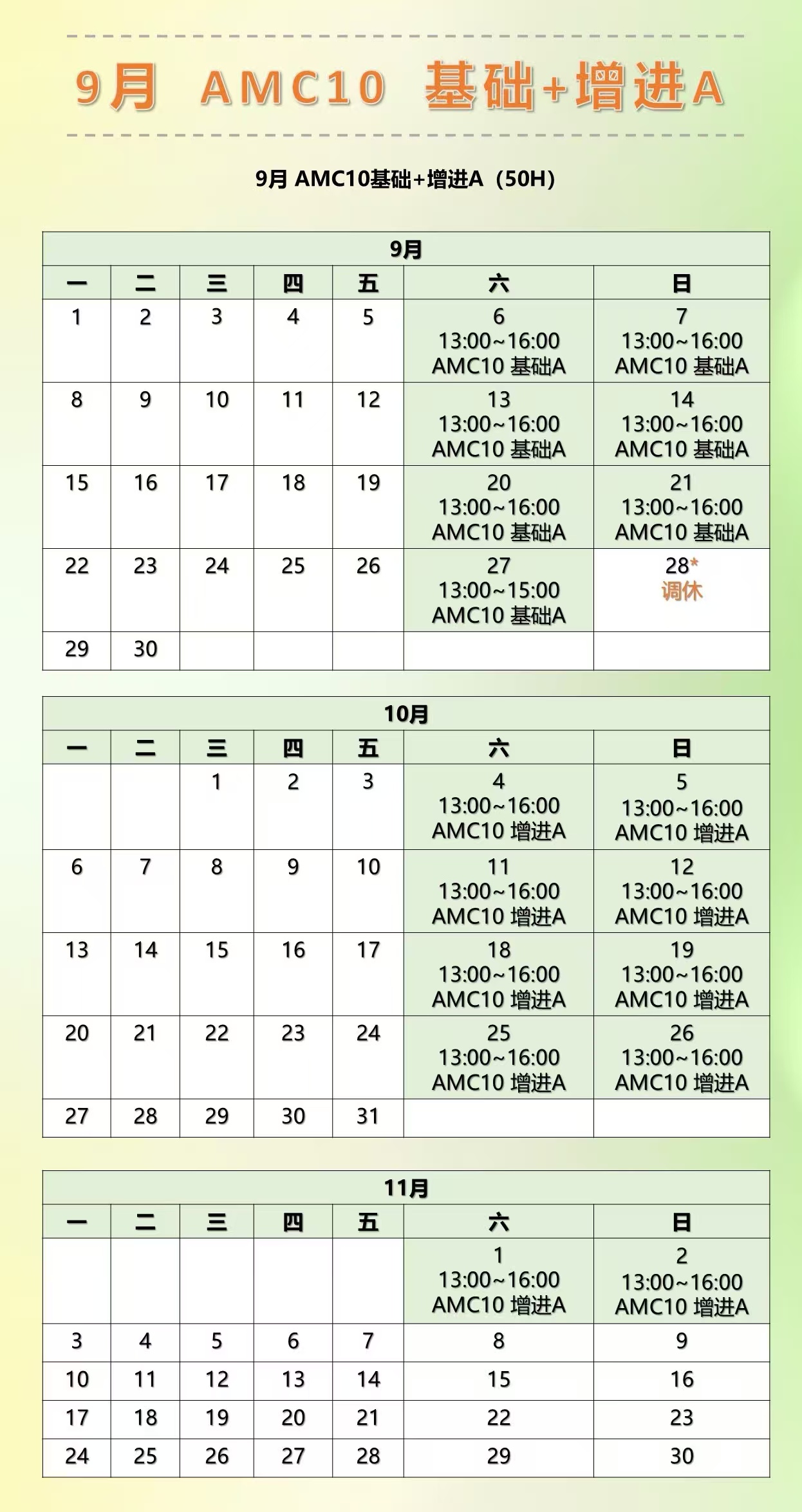 为助力学员高效备考,充分挖掘潜力,我们精心设计了 2025年AMC10系统集训课程,总课时为 50H。课程采用科学的阶段性安排,覆盖基础到冲刺: