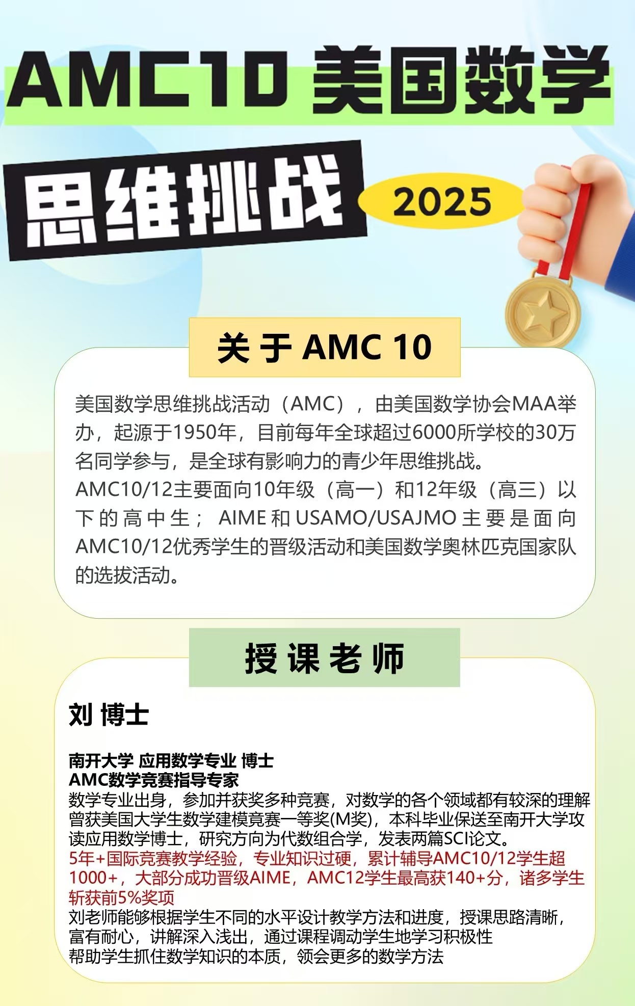 2025年AMC10的黄金备战期已经开竞始!无论您是希望冲击奖项、为升学添彩,还是系统提升数学思维与竞赛能力,本次由南开大学刘博士亲授的课程都是您不可错过的机遇。9月基础课程名额有限,抢位刻不容缓!