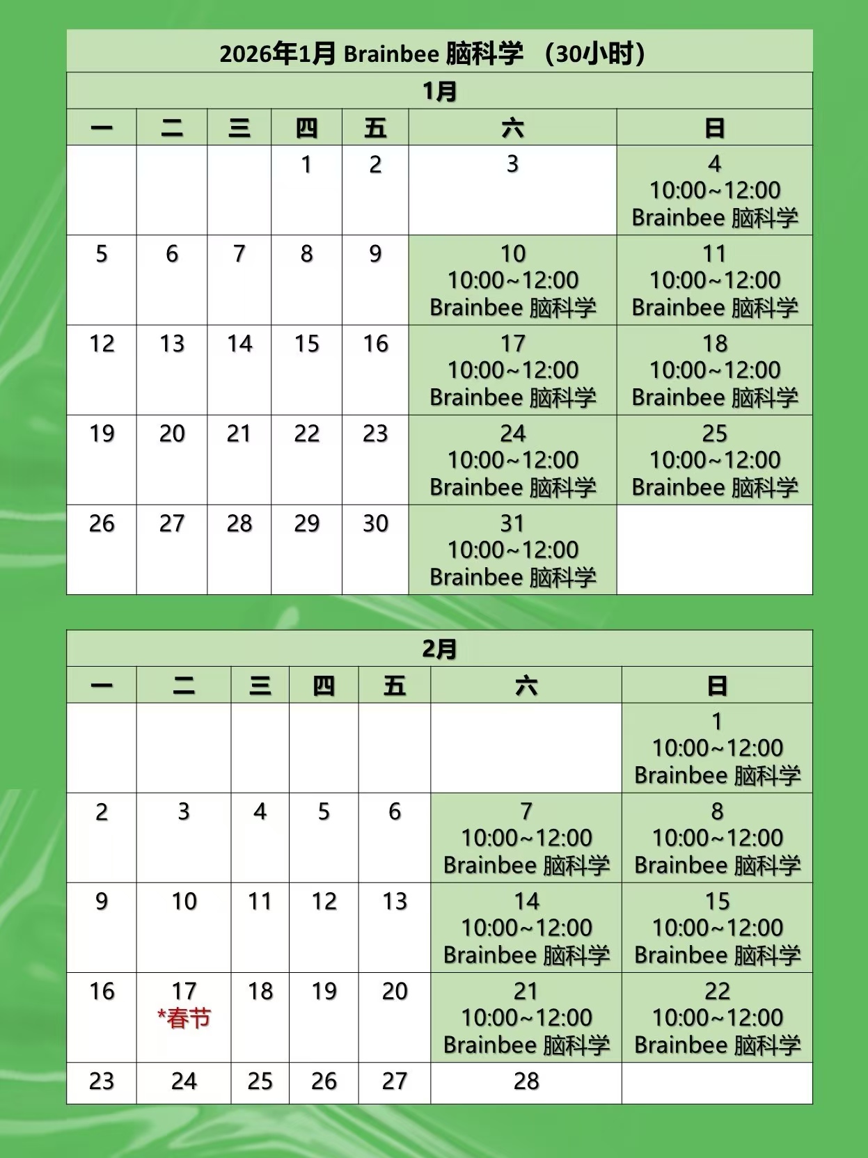 为确保学习效果,本次活动课程经过精心设计。课程将于2026年1月至2月进行,总课时为30小时。授课时间安排在1月的每周六、日上午10:00至12:00。2月份的课程安排将避开春节假期,同样集中于周末上午时段。这种紧凑而合理的安排,旨在帮助学员们在不影响正常学业的前提下,沉浸式地探索脑科学的广阔世界。