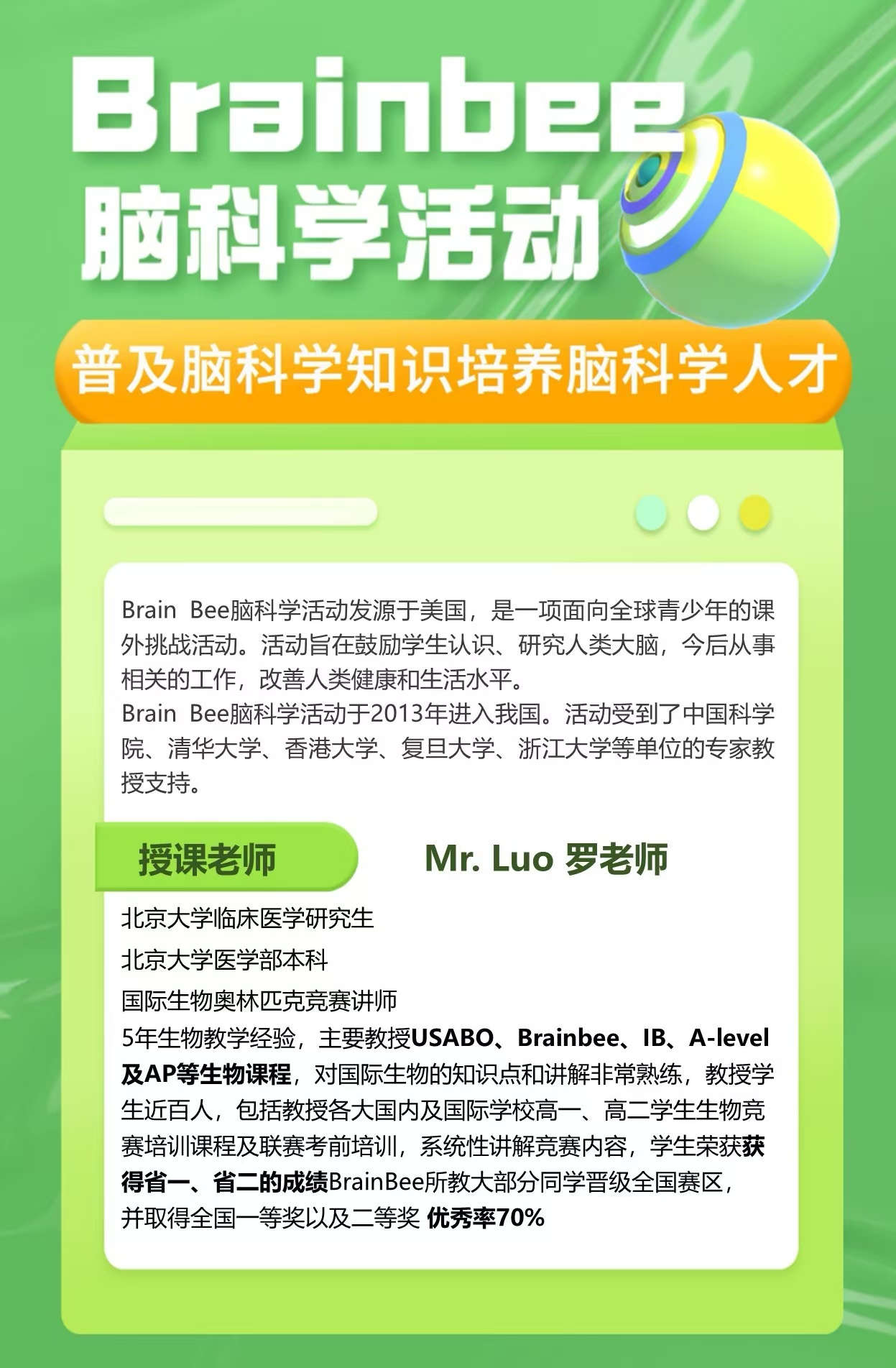 在长达五年的生物教学生涯中,罗老师主要专注于USABO、Brainbee、IB、A-level及AP等生物课程的教学,对国际生物课程的知识体系与竞赛要点有着深刻理解和精准把握。他已累计教授近百名学生,其中许多来自国内外知名中学。在罗老师的系统化指导下,学生们在各类生物竞赛中表现优异,屡获省级一等奖、二等奖;在Brainbee赛事中,其教授的大部分学生成功晋级全国赛,并多人斩获全国一等奖、二等奖的殊荣,整体优秀率高达70%。