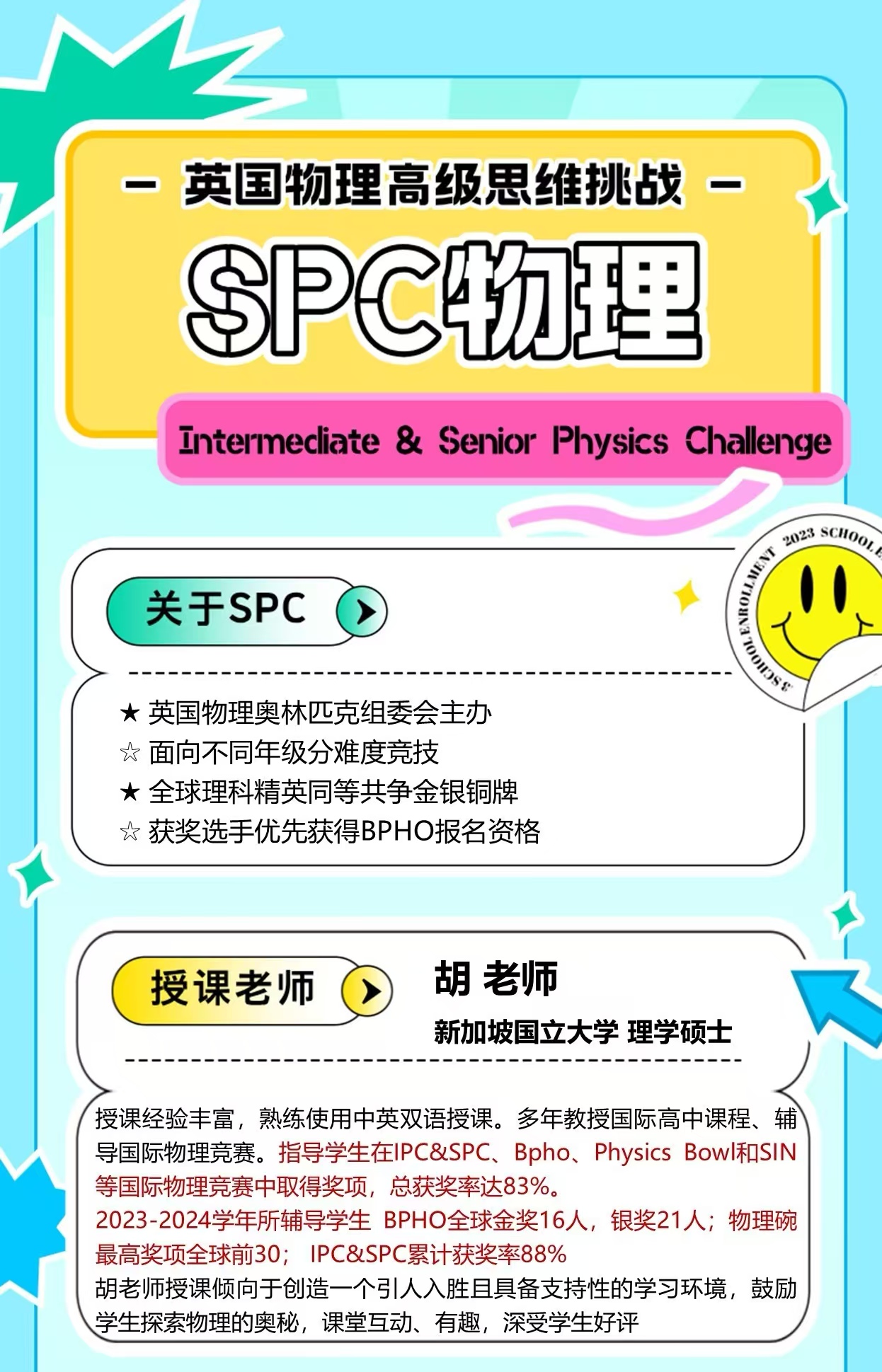 英国物理高级思维挑战(SPC)由英国物理奥林匹克组委会主办,是针对全球高中生的高级物理竞赛。我们特别推出SPC物理精英班,由资深竞赛导师胡老师主讲,帮助学生在SPC竞赛中取得优异成绩,获得BPhO报名优先资格。