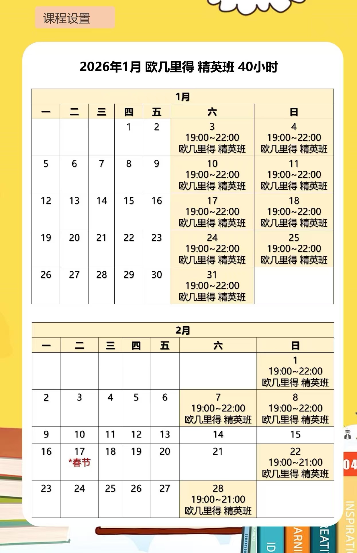 本期欧几里得数学竞赛精英班将于2026年1月至2月期间开展。课程设计紧密围绕竞赛大纲,总计40课时,进行全面深入的考点梳理、真题精讲与冲刺训练,确保学员得到充分、高效的备赛指导。